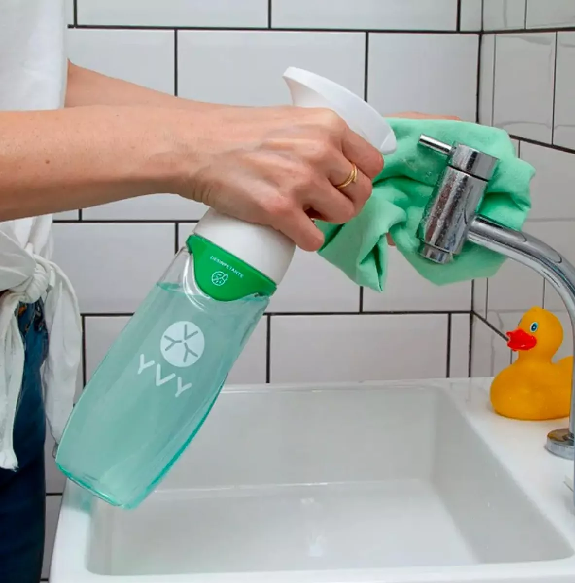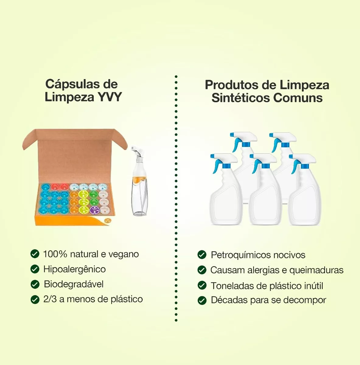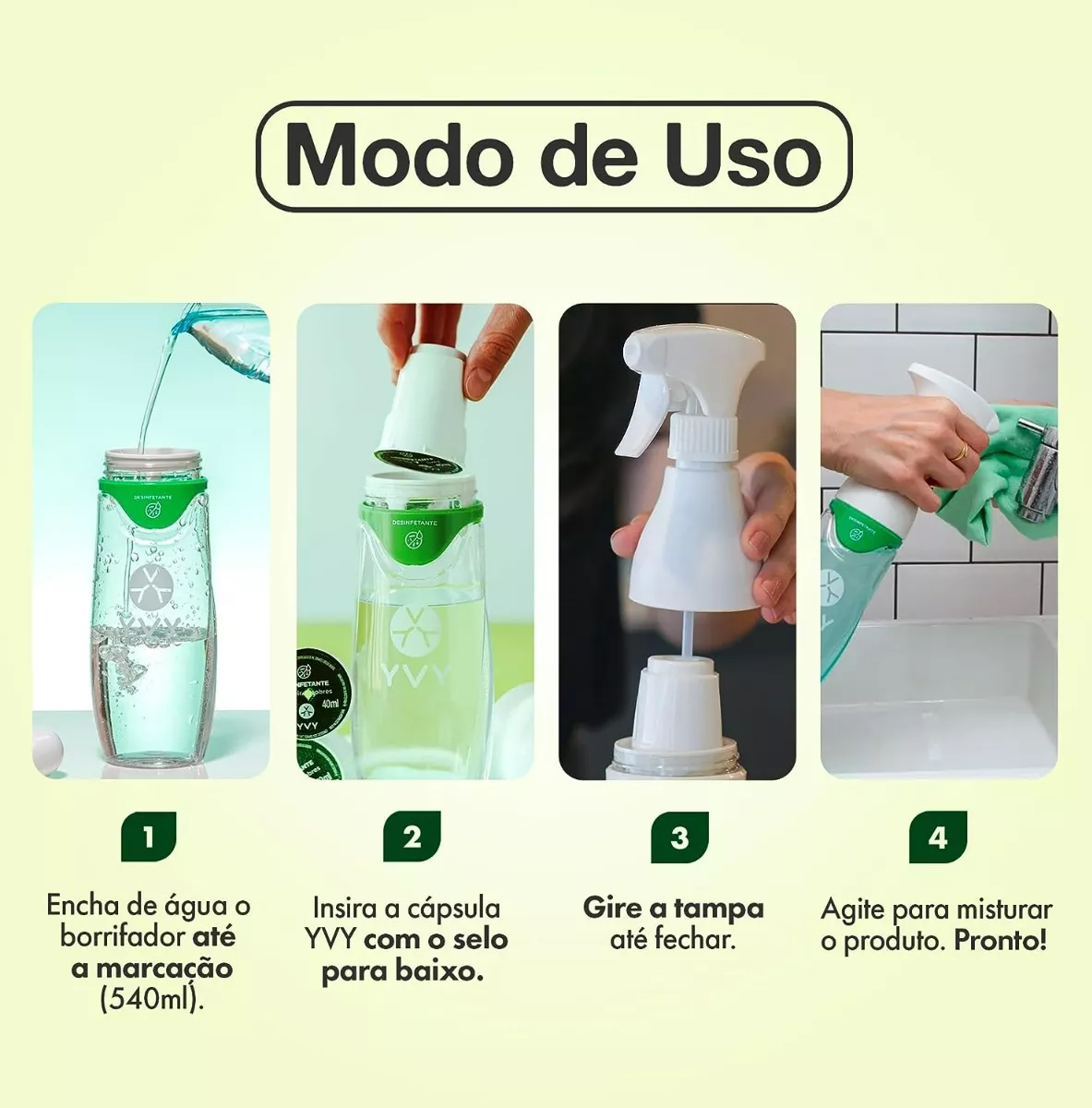 É fácil; você precisa de um Borrifador YVY que é reutilizável e uma cápsula. Encha o Borrifador YVY com água da torneira. Coloque a cápsula dentro (de cabeça para baixo). Clique e limpe. Cada cápsula faz 540 ml. Até seus filhos podem usar.