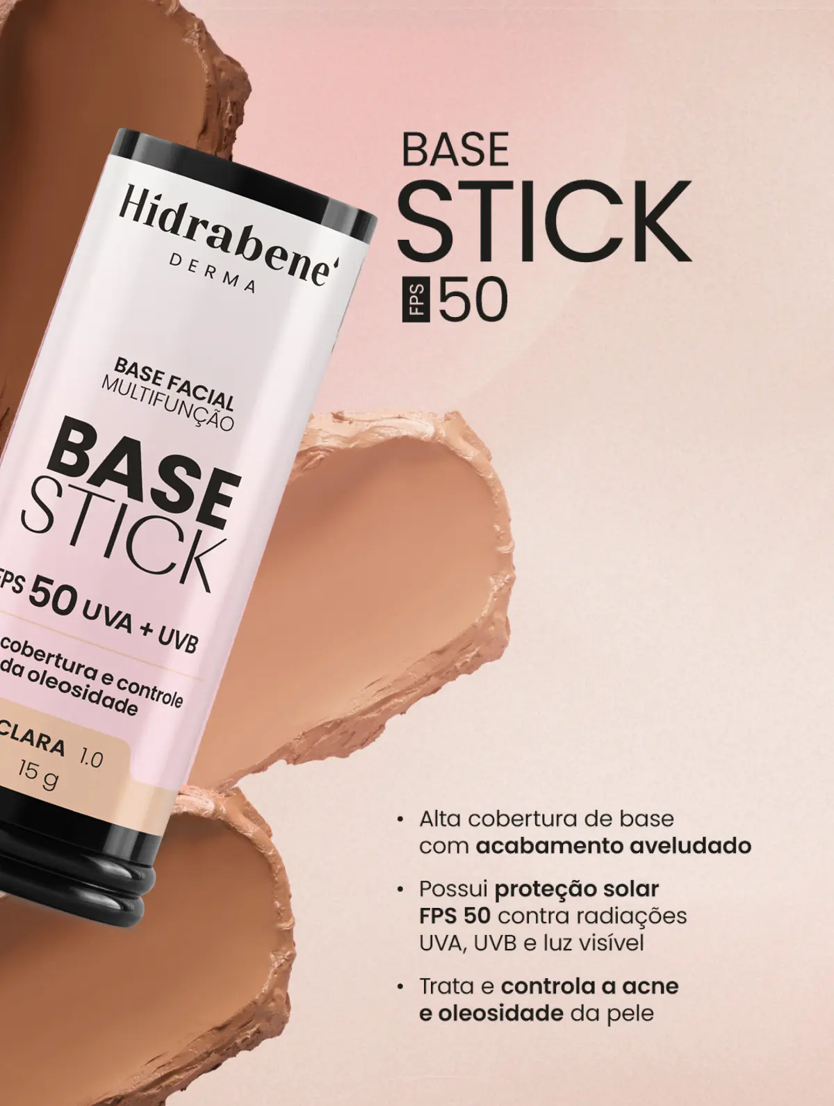 Ideal para todos os tipos de pele, especialmente as oleosas e acneicas, a Hidrabene Derma Base Stick FPS 50 une proteção, beleza e tratamento cosmético em uma aplicação rápida e prática.