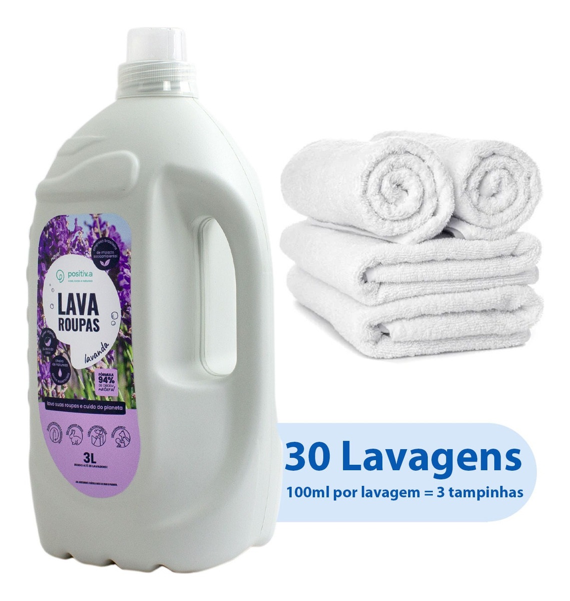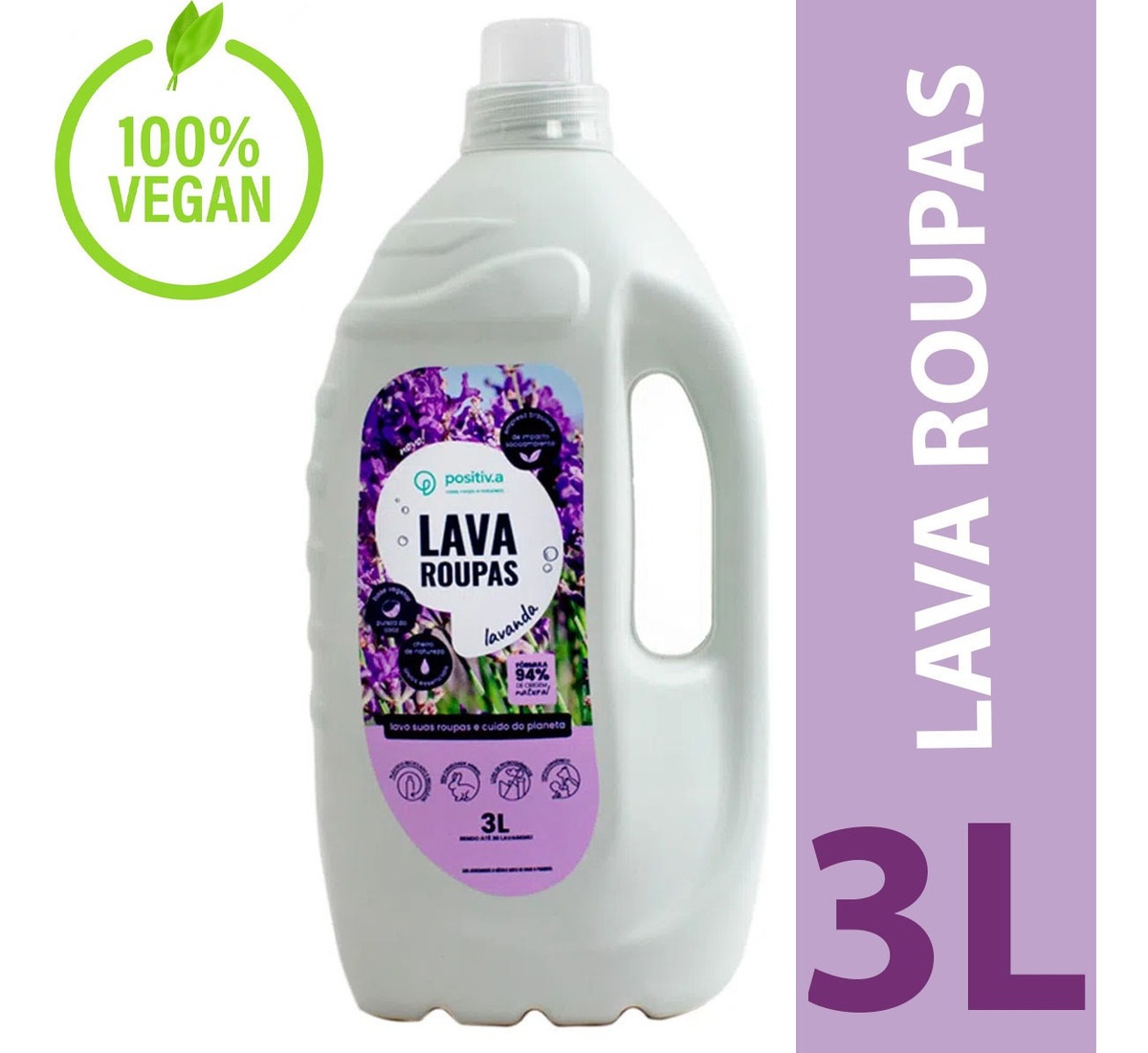 Lava Roupas Líquido de coco com ingredientes naturais, veganos e livres de petroquímicos. Fórmula ecológica e hipoalergênica. O delicioso perfume de Lavanda foi criado exclusivamente pra positiv.a: feito com óleos essenciais, é seguro para a saúde, para a natureza e mantém a roupa perfumada mesmo depois de seca!