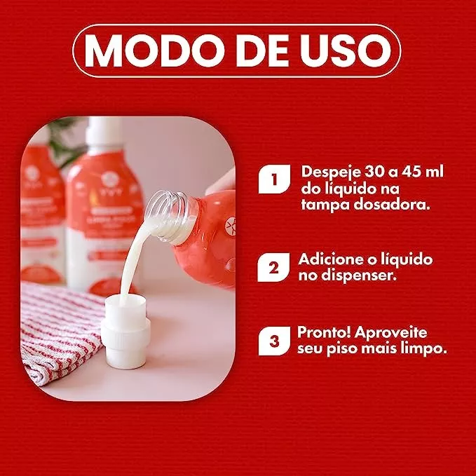 A versão em frasco vai acompanhada de uma tampa dosadora que deve ser diluída em 2,5 litros de água. Cada frasco rende até 40 litros. Maior quantidade para facilitar sua vida.
