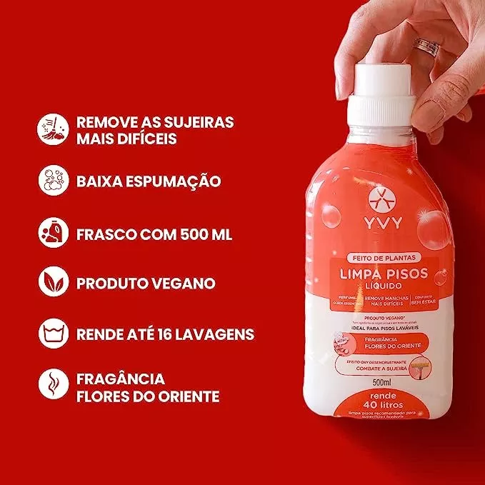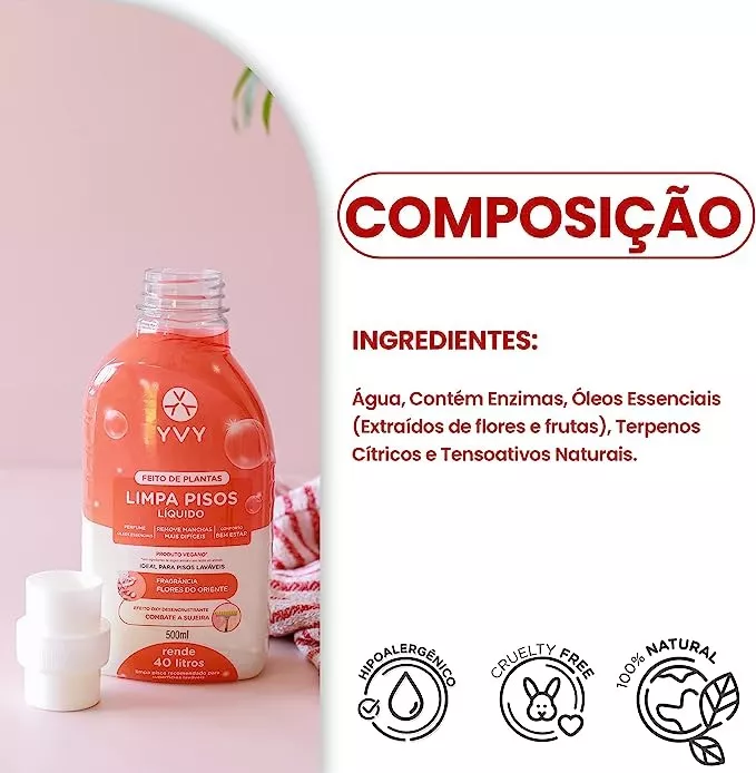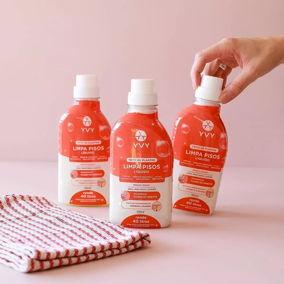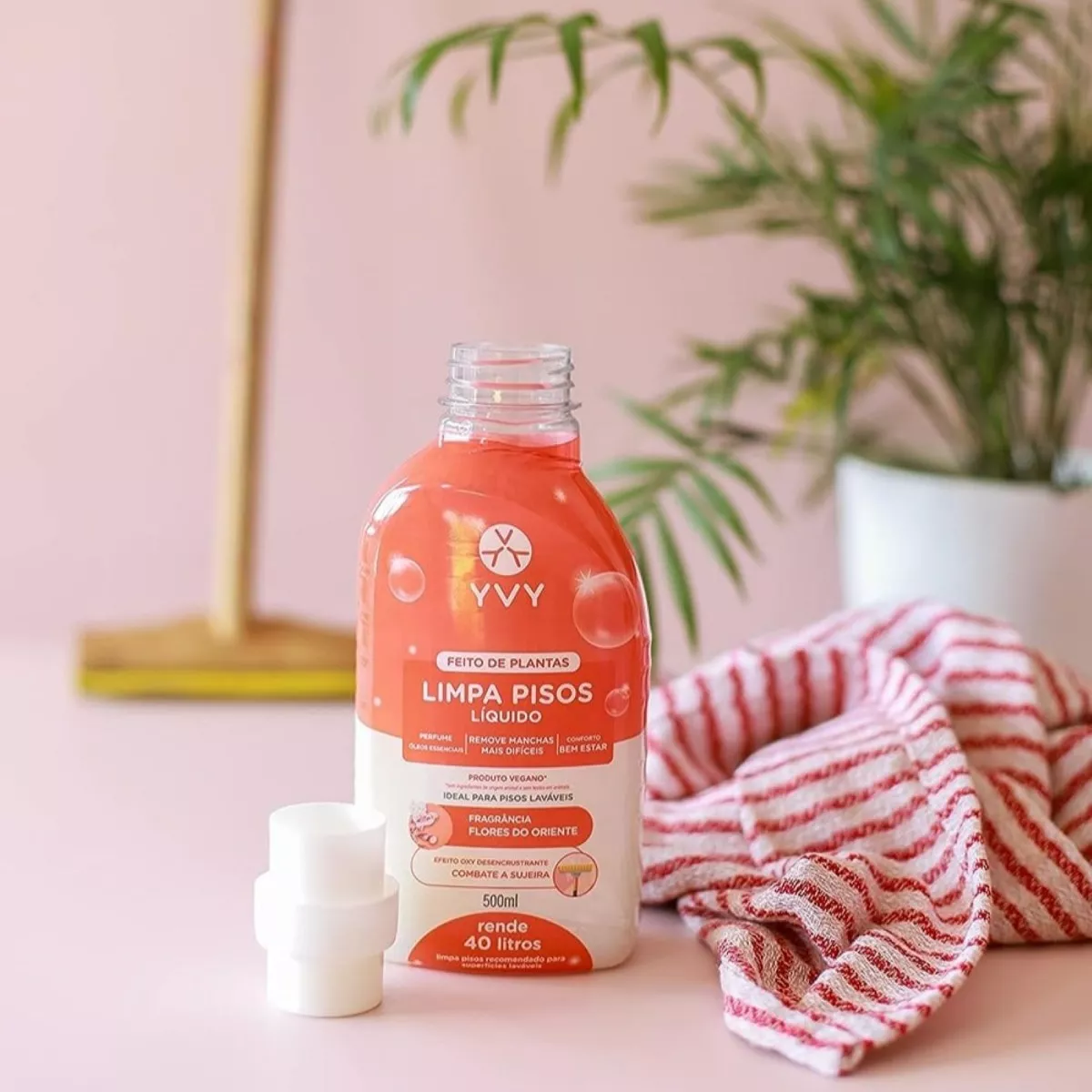 Limpa pisos líquido natural YVY é um produto feito especialmente sob medida para os nossos clientes. Disponível na fragrância de Flores do Oriente, o limpa pisos líquido deixa sua casa limpa e perfumada com óleos essenciais.